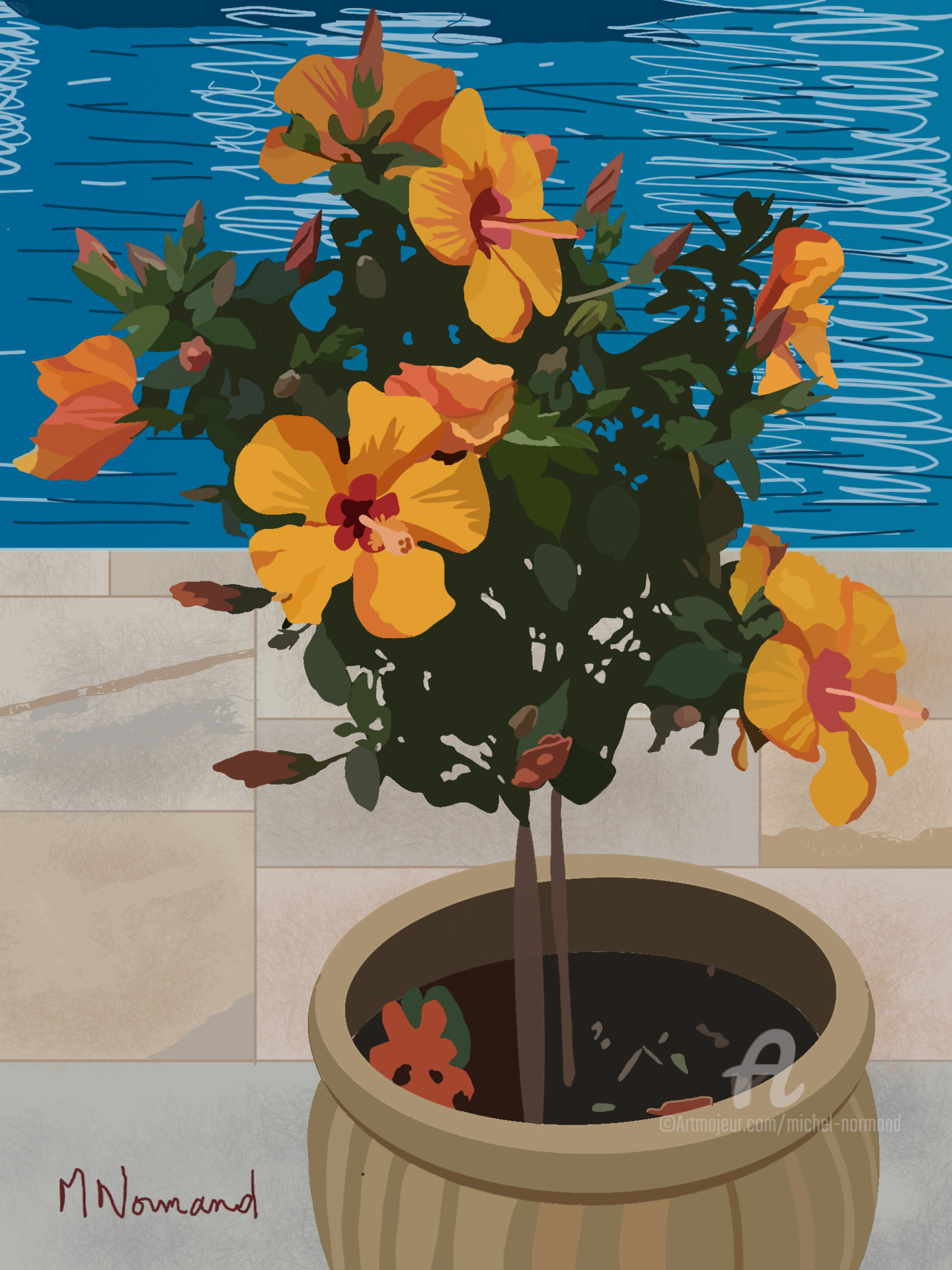 2021-01-12 hibiscus sur la terrasse (jaune vif au départ il est devenu orange avec le temps)